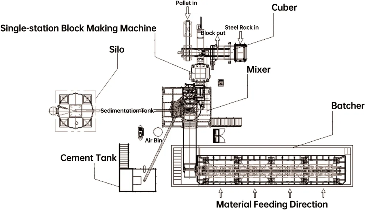 Dây chuyền sản xuất đạt được công thức nguyên liệu chính xác thông qua hệ thống trộn và trộn. Vật liệu được vận chuyển qua dây đai và được nâng lên máy trộn, tại đây quá trình trộn kỹ lưỡng diễn ra trước khi được chuyển sang máy trộn vật liệu đối diện. Bàn ép chính trượt ra ngoài và trong quá trình nạp vật liệu bề mặt, phễu định lượng sẽ phân phối chính xác vật liệu vào khung khuôn trên bàn trượt. Bàn sau đó di chuyển bên dưới khung ép để tạo hình lọc ép. Trong khi đó, pallet được chuyển đến vị trí phụ của bàn bằng máy cấp pallet. Trong chu kỳ định lượng tiếp theo, các viên gạch đã tạo hình sẽ tự động được tháo khuôn. Hệ thống hoàn thiện đồng bộ khâu cấp pallet và loại bỏ gạch ướt trong quá trình ép, đảm bảo sản xuất hiệu quả và liên tục.